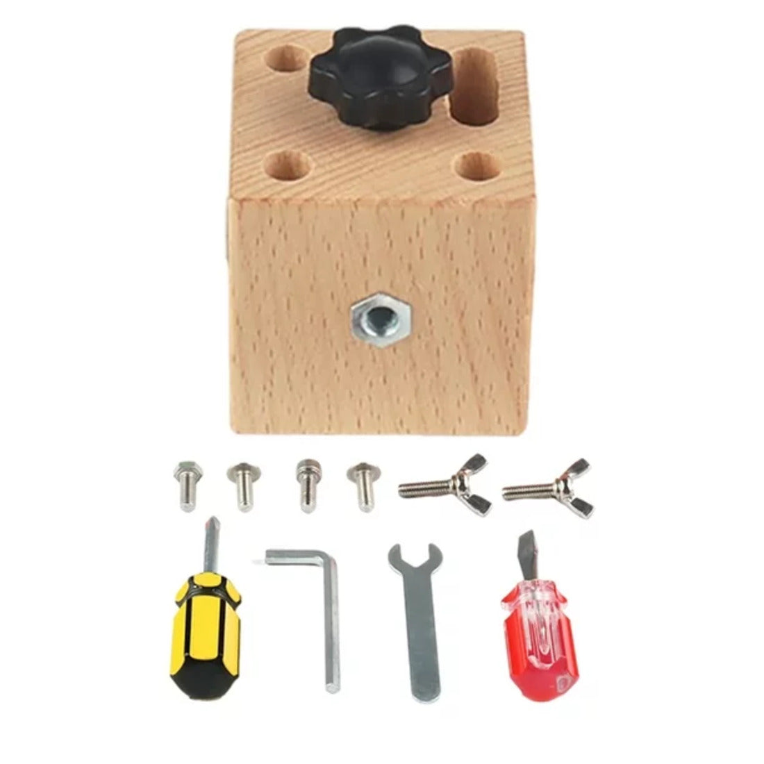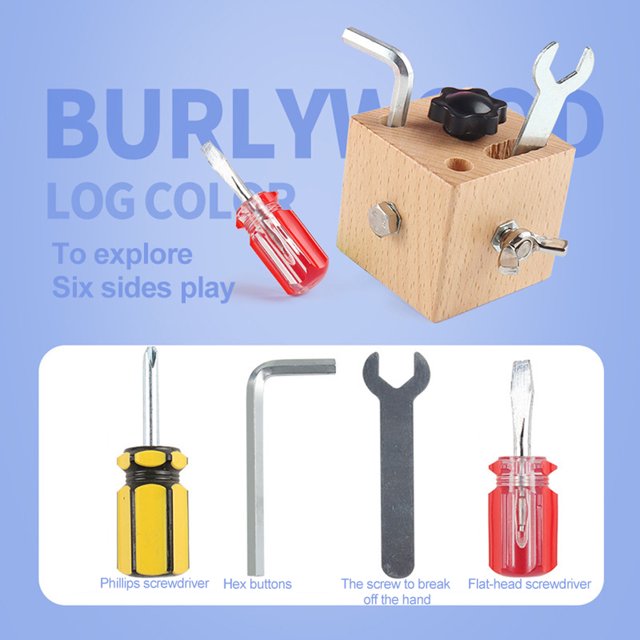 Cada lado del cubo presenta una experiencia de juego única. Un lado puede incluir ranuras donde los niños pueden insertar y girar "tornillos" con un destornillador de juguete, mientras que otros pueden tener pernos que se ajustan con una llave Allen. Estas actividades no solo desarrollan habilidades motoras finas, sino que también promueven la coordinación mano-ojo y la destreza manual.