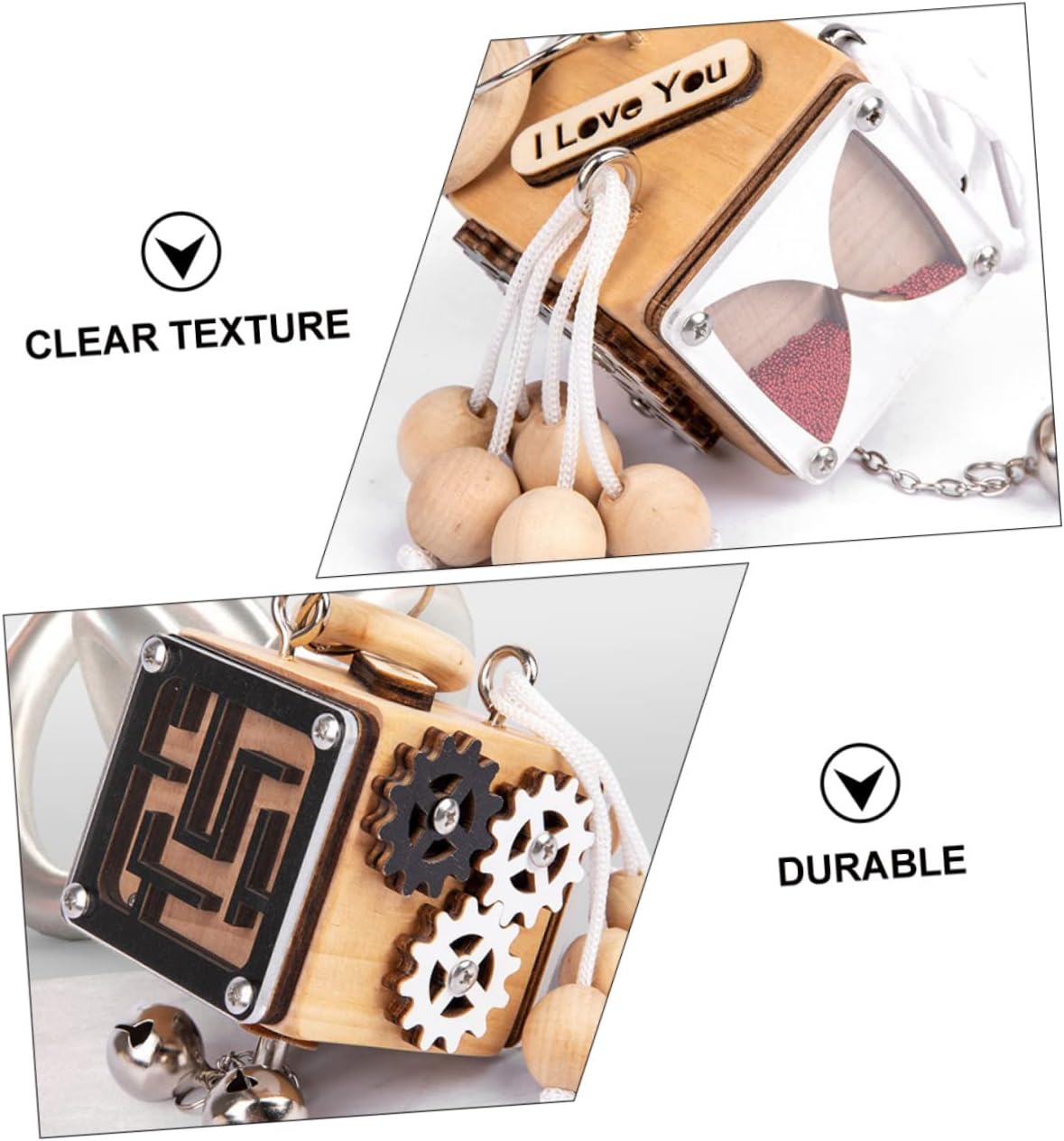 Además, el cubo cuenta con un reloj de arena en una de sus caras, que proporciona una forma divertida y visualmente atractiva de medir el tiempo. Los niños pueden darle la vuelta al cubo y observar cómo la arena fluye a través del reloj de arena, ayudándoles a comprender conceptos de tiempo y duración de una manera tangible y práctica.