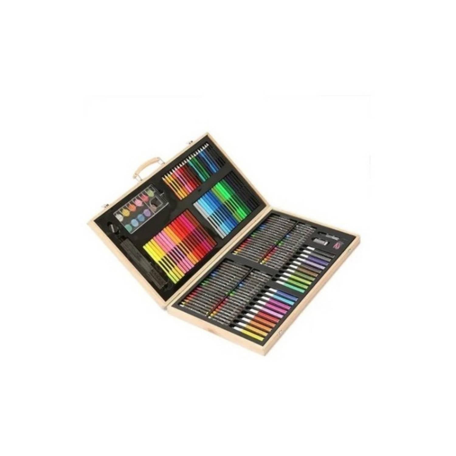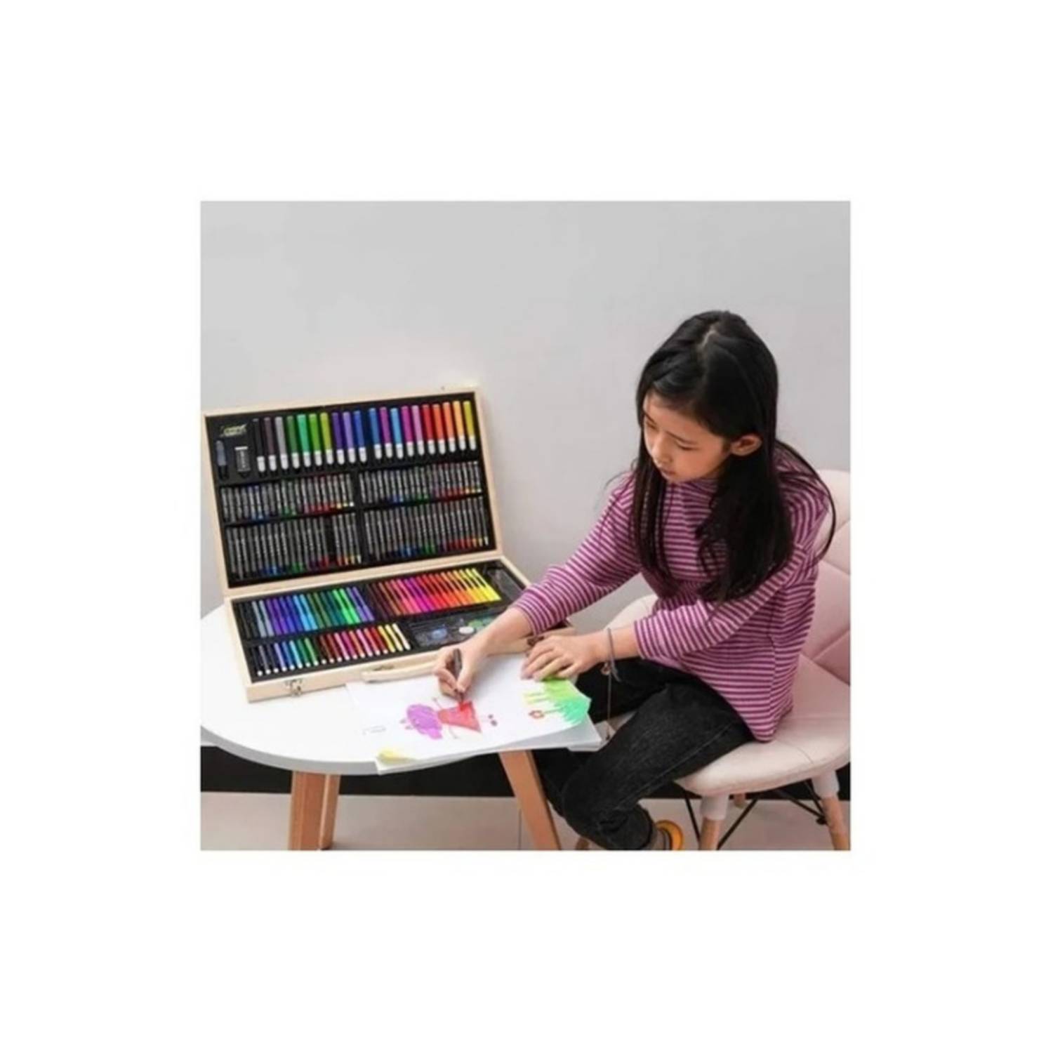 Transforma la creatividad en una experiencia portátil y elegante con nuestra maleta de madera y set de arte de 180 piezas con lápices para colorear.