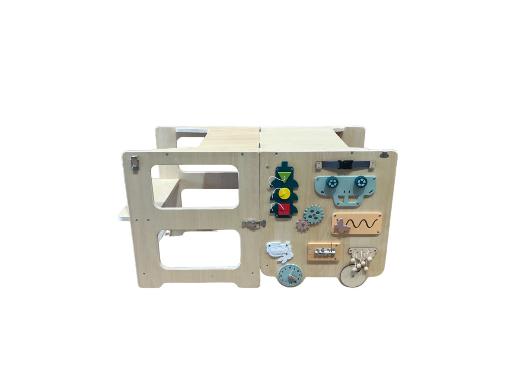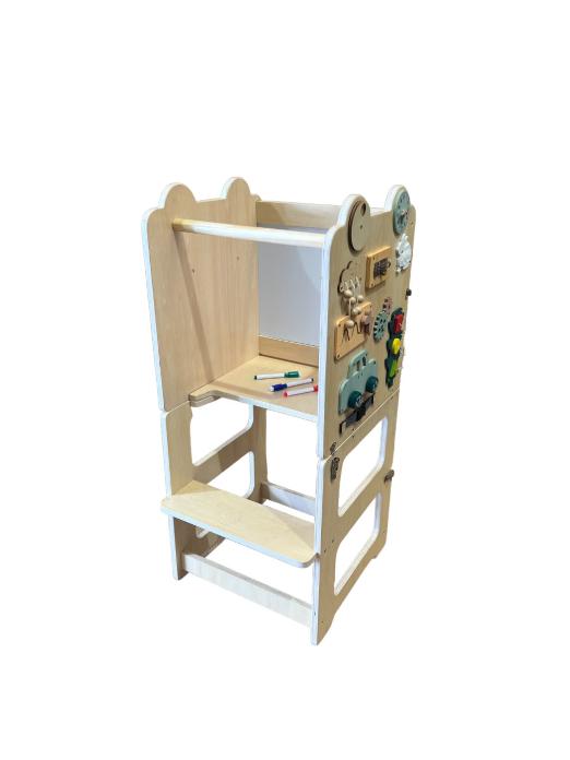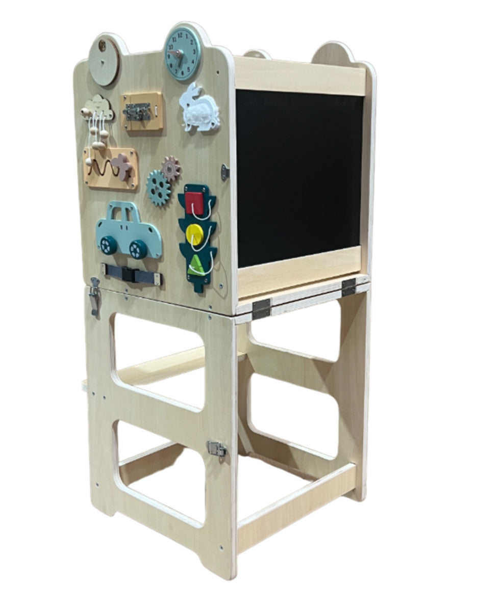Ademas se puede transformar en un escritorio quedando muy firme ya que tiene click de seguridad. ¡Haz que cada momento sea una oportunidad para el crecimiento y la exploración con la torre de aprendizaje sensorial Montessori!