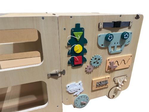 Posee distintas actividades para realizar como Pizarra para dibujar, y actividades sensoriales como engranajes, figuras, broches, cierres, reloj, conejo con textura suave, pestillo, etc, etc